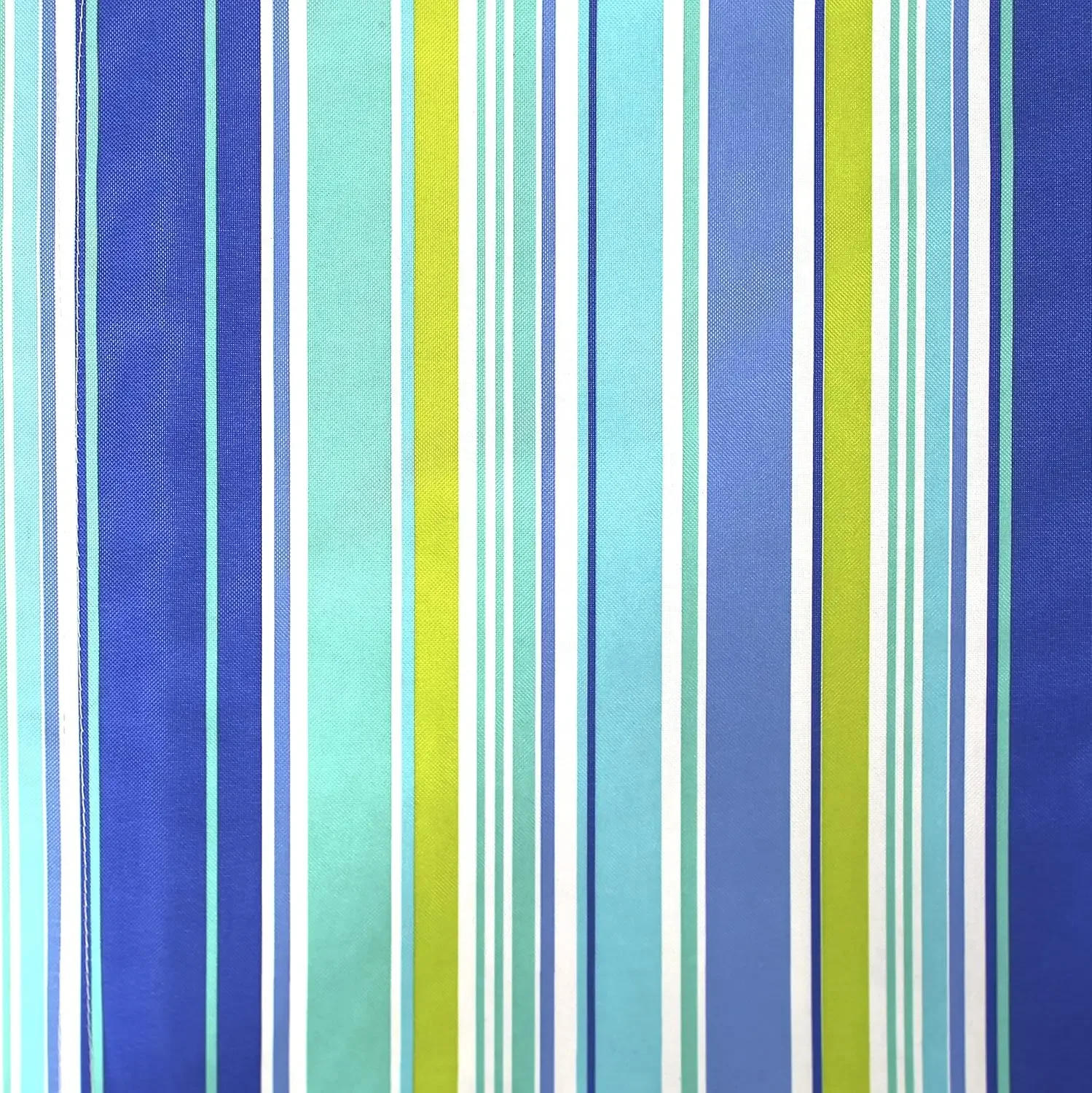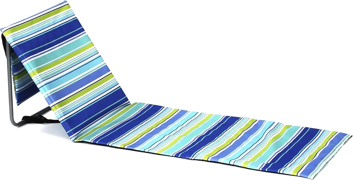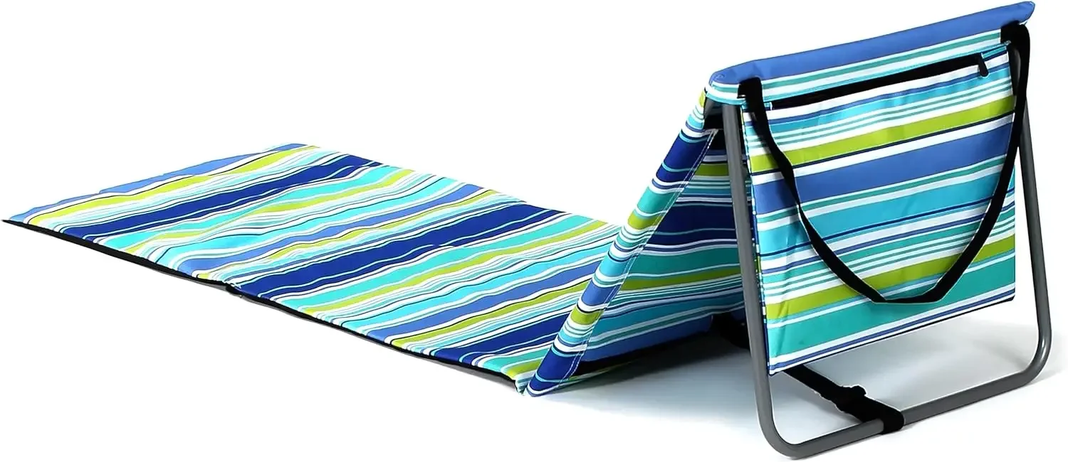 Relax at the beach on this portable chair for adults, featuring a blue and green striped pattern. The beach chair features an adjustable backrest and a a detachable zippered pocket for keeping small items out of the sand. A tropical vacation essential, it folds flat when not in use and carries via an adjustable shoulder strap. Among beach accessories, a comfortable lounger like this is a necessity. 20-7/8″W x 62-1/4″L. Polyester, steel and foam.