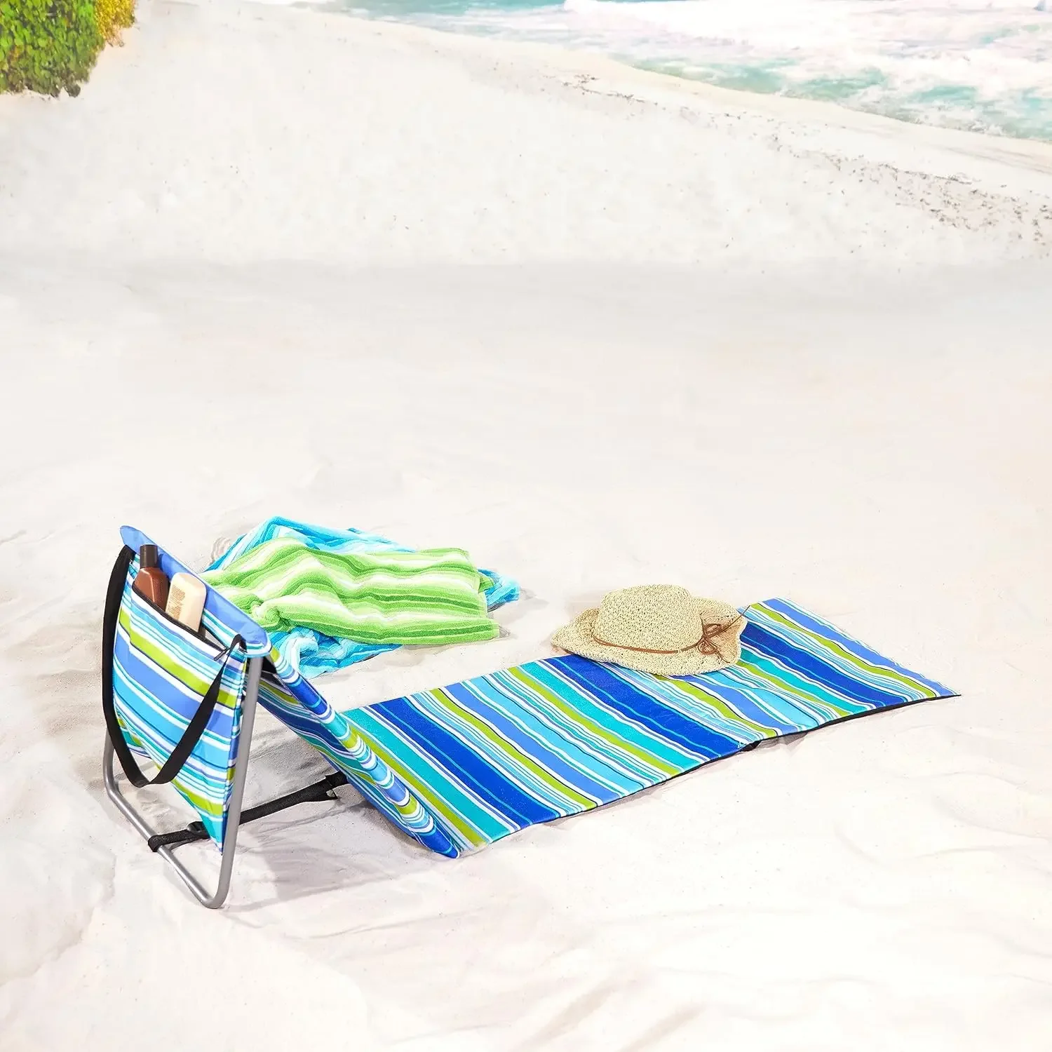 Relax at the beach on this portable chair for adults, featuring a blue and green striped pattern. The beach chair features an adjustable backrest and a a detachable zippered pocket for keeping small items out of the sand. A tropical vacation essential, it folds flat when not in use and carries via an adjustable shoulder strap. Among beach accessories, a comfortable lounger like this is a necessity. 20-7/8″W x 62-1/4″L. Polyester, steel and foam.