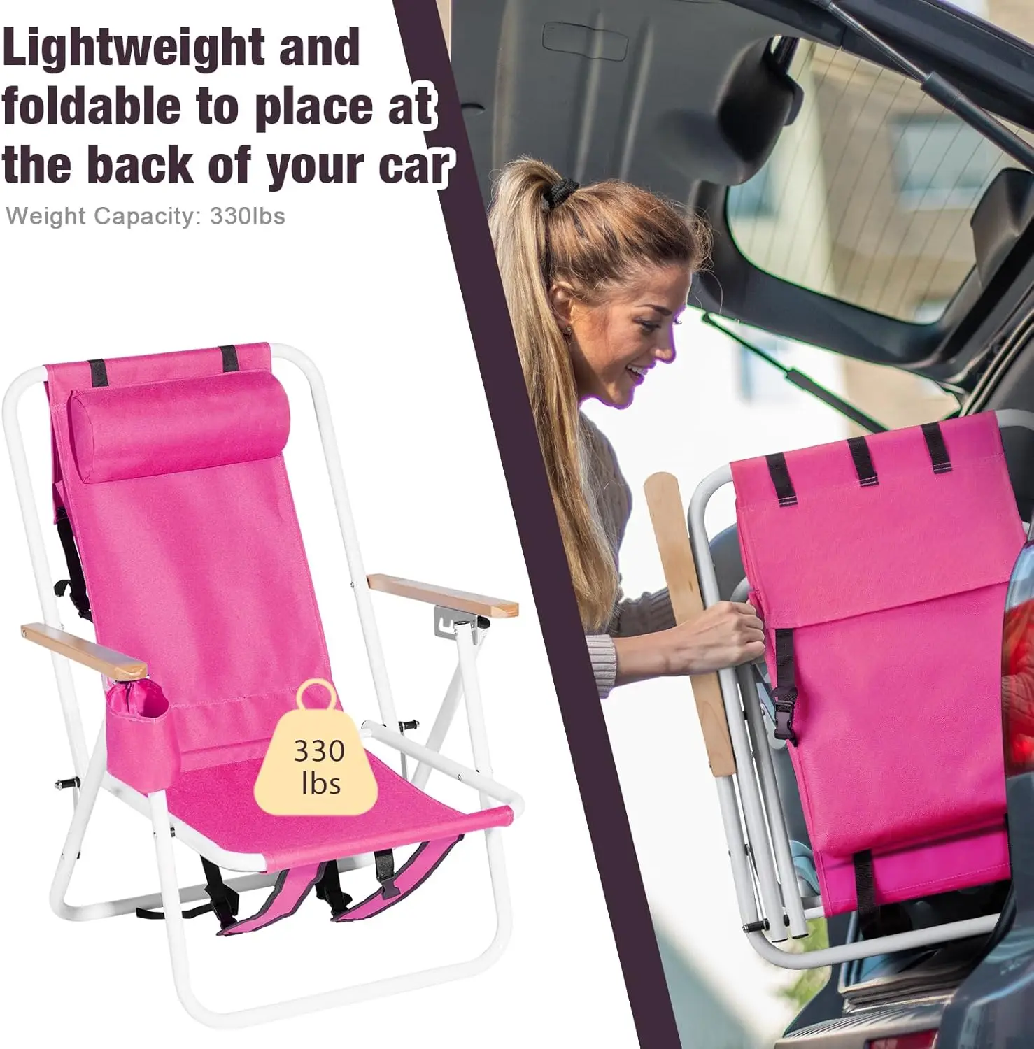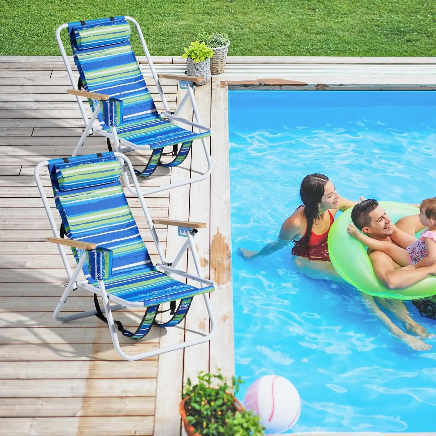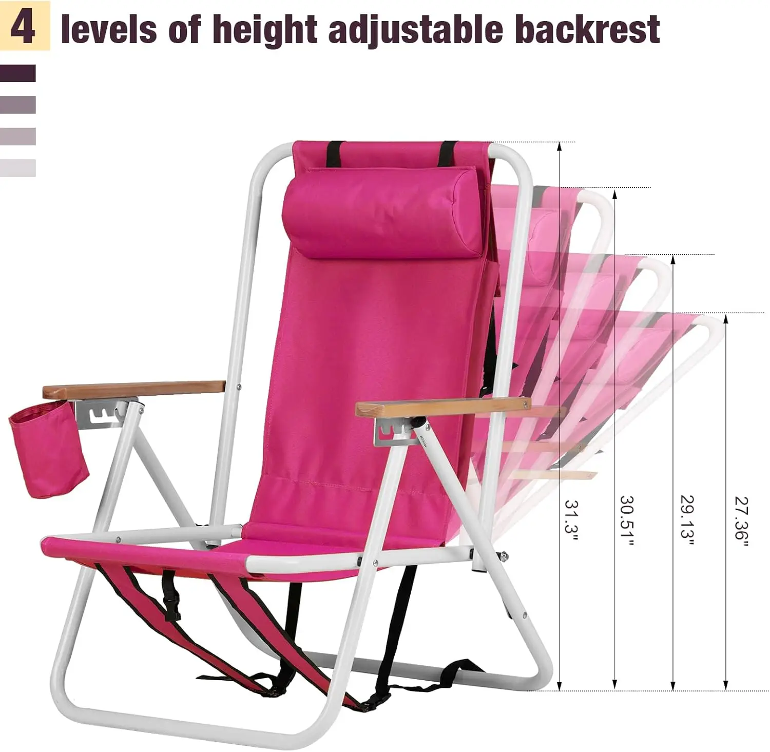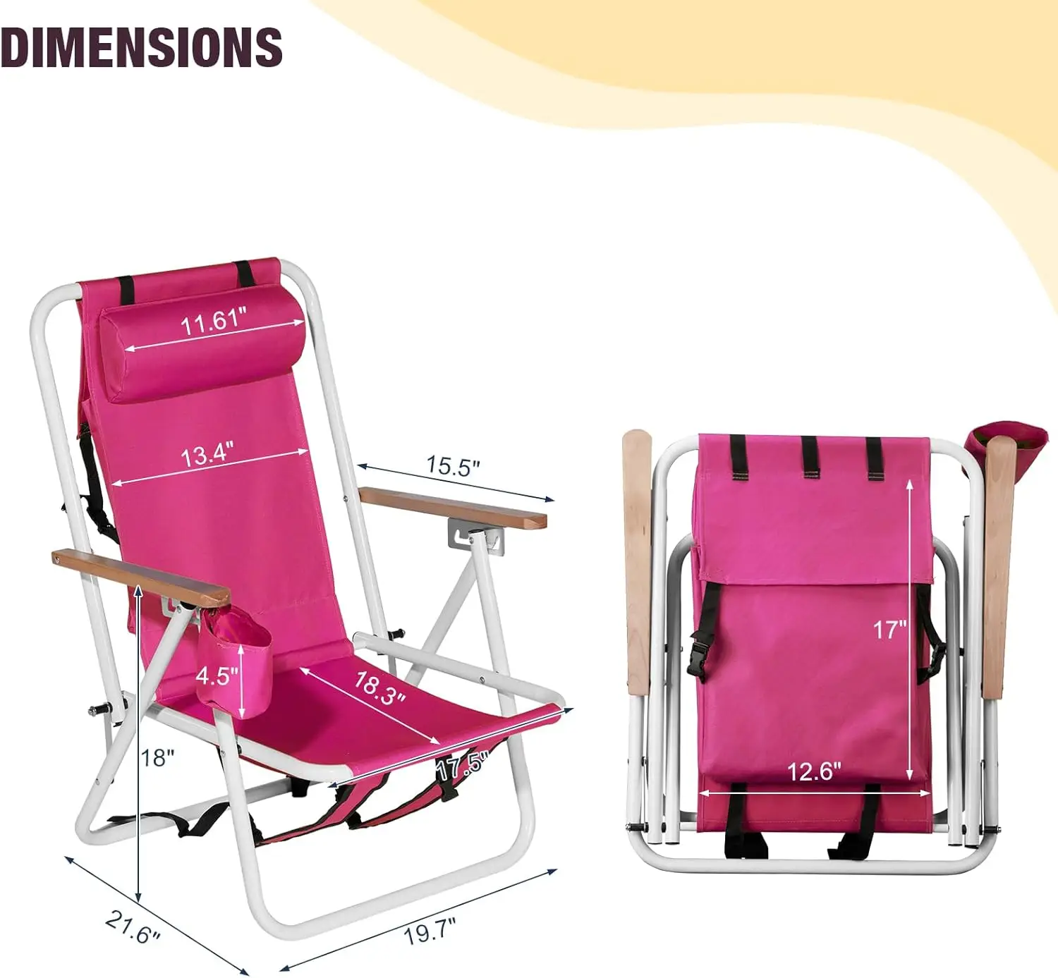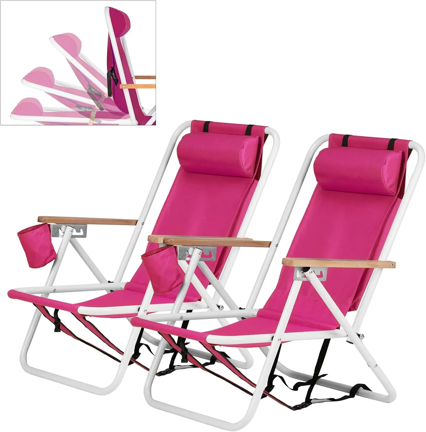Folding Beach Chair with Adjustable Headrest, 4 Flexible Tilt Angles, Cup Holder, Portable High Strength Cleanable Fabric
